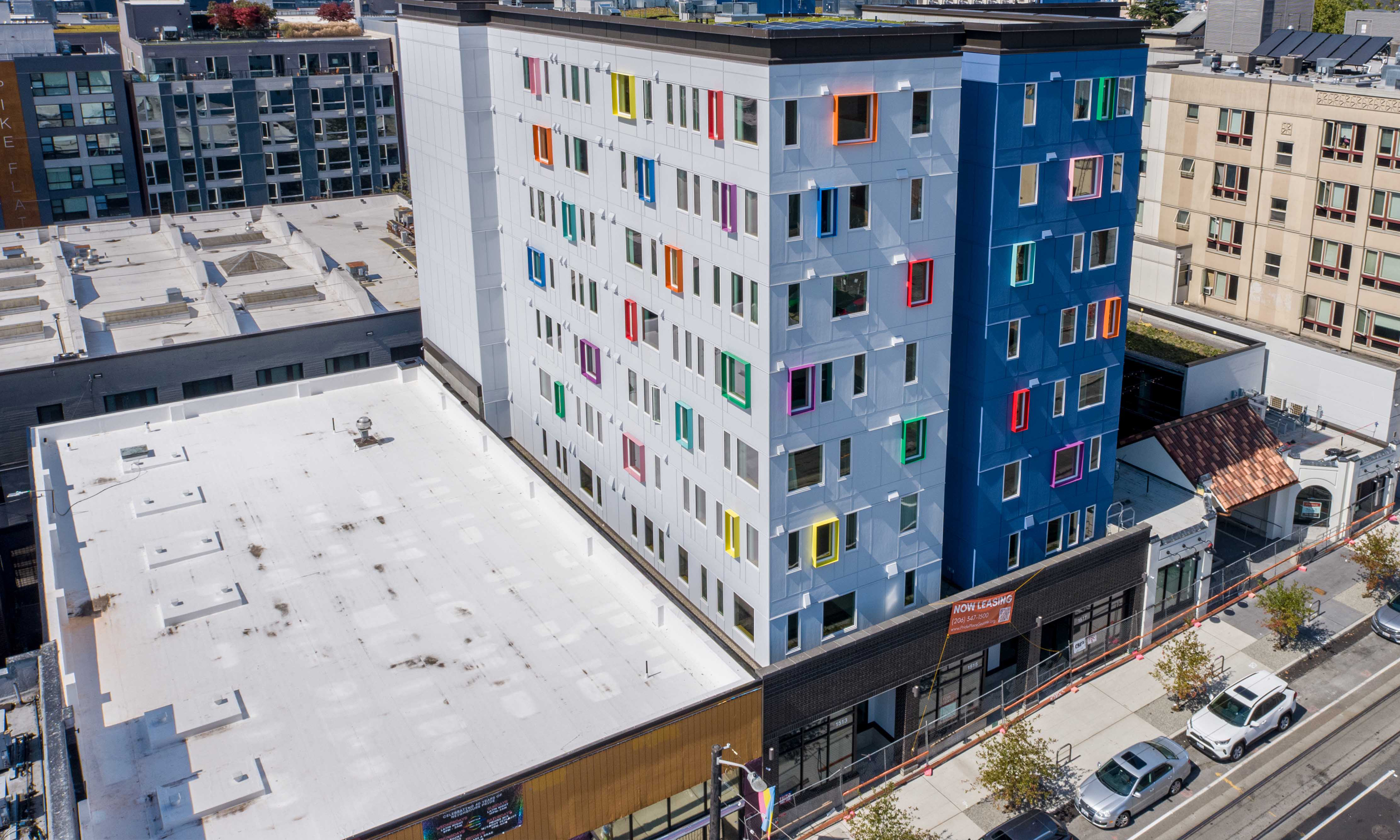 Pride Place is Seattle’s first affordable housing project designed to be an affirming environment for LGBTQIA+ seniors, located in the heart of Seattle’s most densely populated neighborhood, Capitol Hill. Construction included the preservation of an existing one-site landmark and character facades. The nearly 78,000 square-foot project sets six floors of type IIIA construction over two type IA levels.