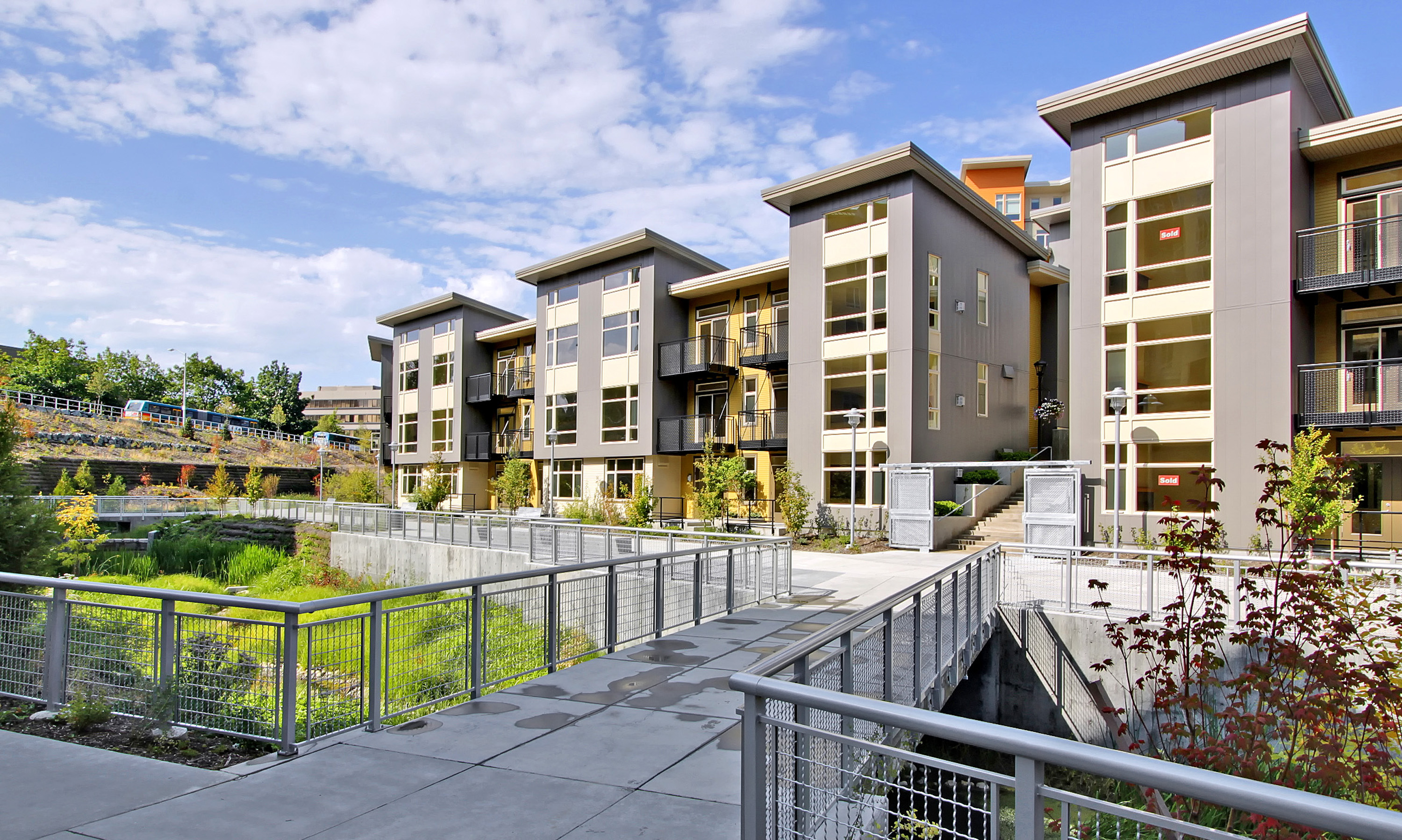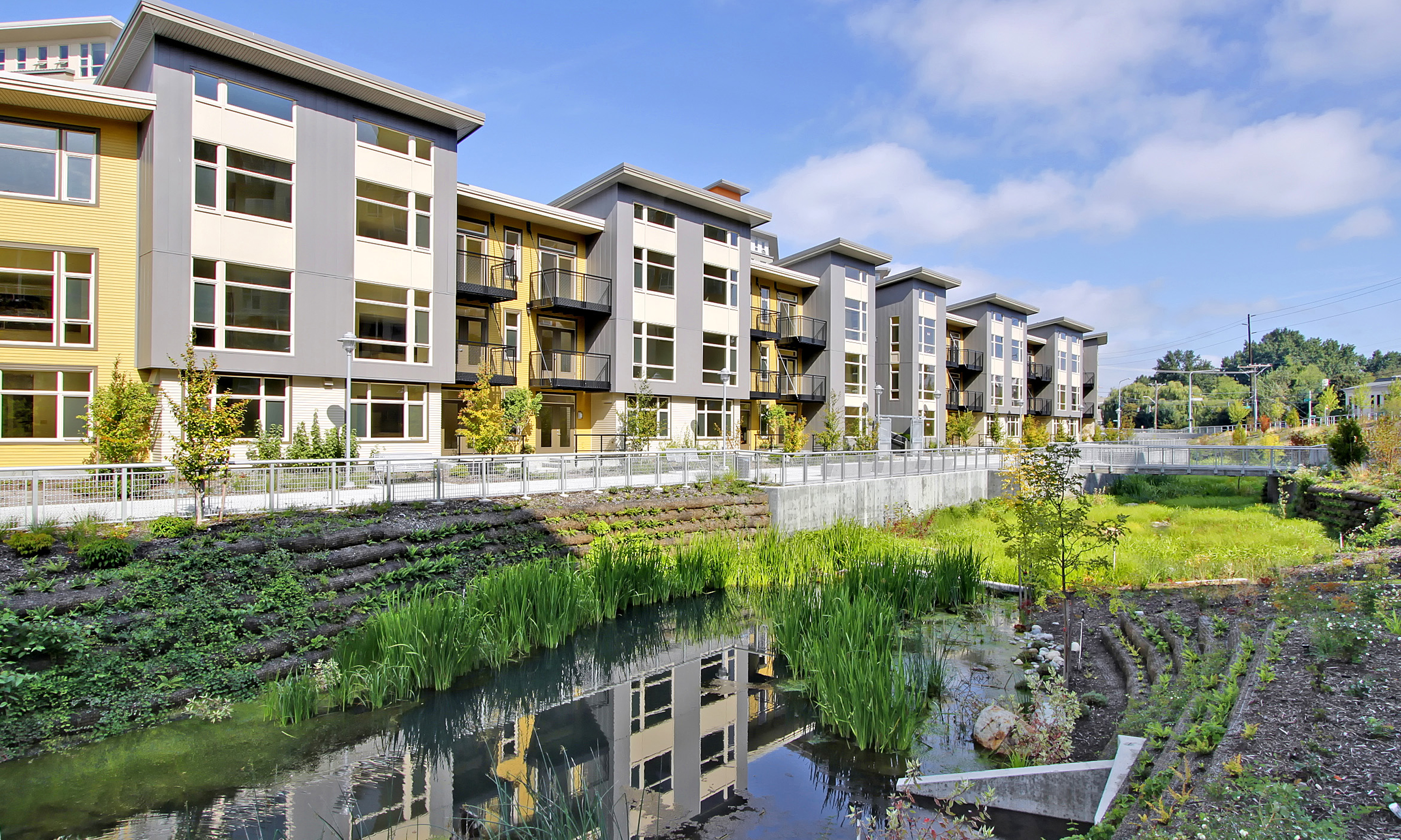 Walsh Construction Co. delivered the majority of the project scope, including the garage, all residential buildings, and the ground-floor retail. Construction took place alongside several concurrent developments on the site, requiring intense coordination. Just south of the mixed-use buildings, Seattle Public Utilities also partnered with Walsh to daylight Thornton Creek and create the Thornton Creek Water Quality Channel—an ecological centerpiece that transforms the area with native landscaping, walking paths, and educational features.