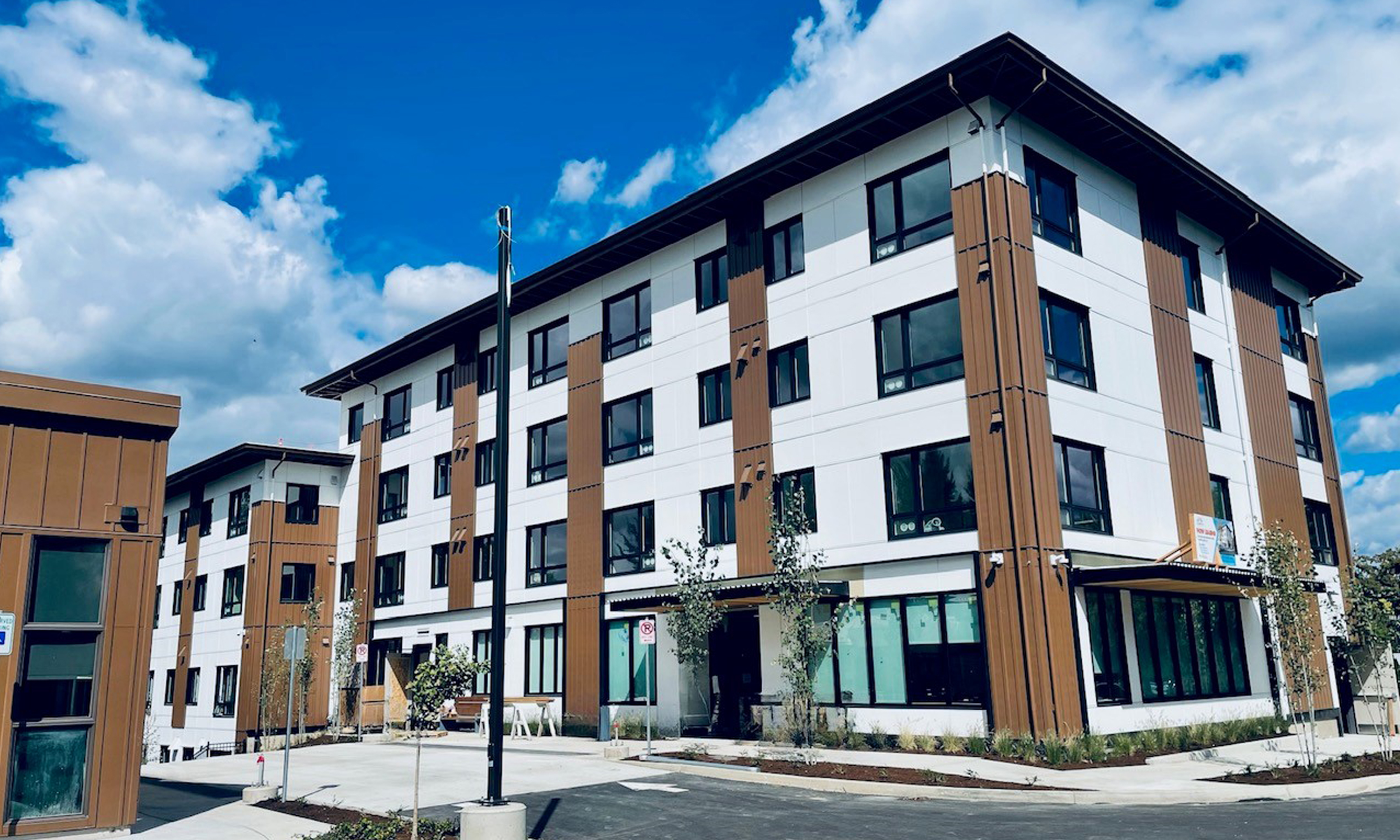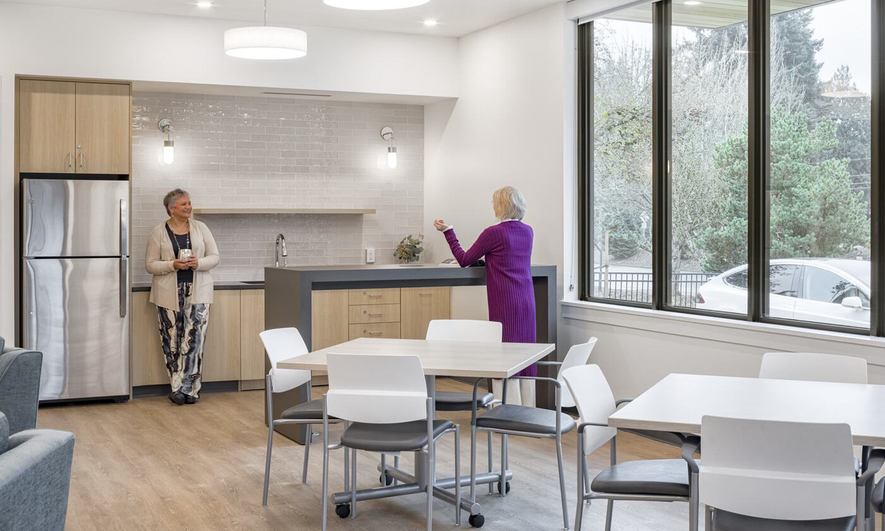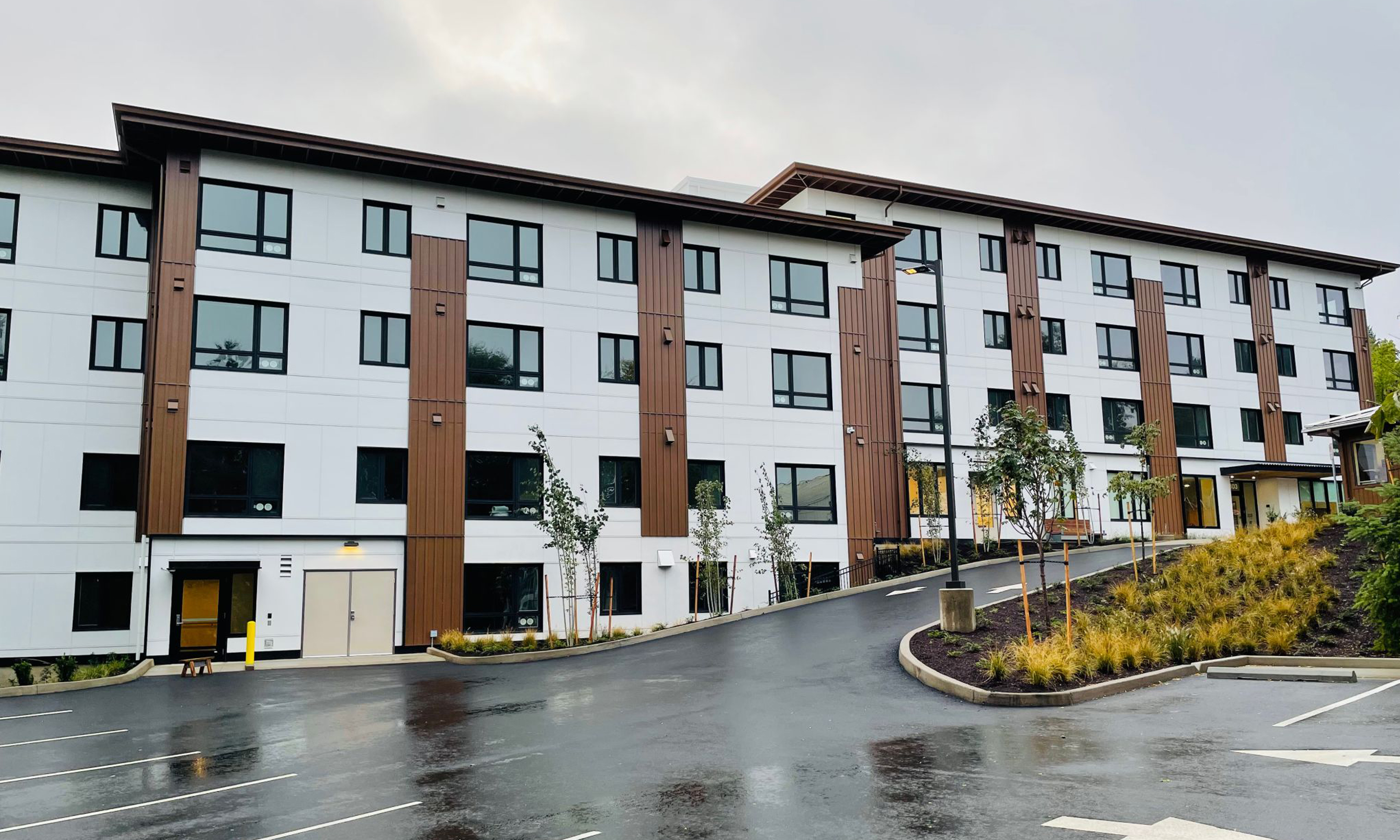 This 4-story building brings 57 new one-bedroom units for our senior citizens, in addition to some helpful site improvements around the existing Tigard Senior Center, including a new connection to the Fanno Creek Trail. Built on a steeply sloped site, the team navigated extensive site and utility work in addition to preserving the delicate wetlands adjacent. Eight apartments are for formerly homeless individuals, including five for formerly homeless veterans. Located next to an active senior center and near public transit and the library, this new development is located on a site owned by the City of Tigard alongside the Tigard Senior Center and Meals on Wheels, and close to the town’s center.