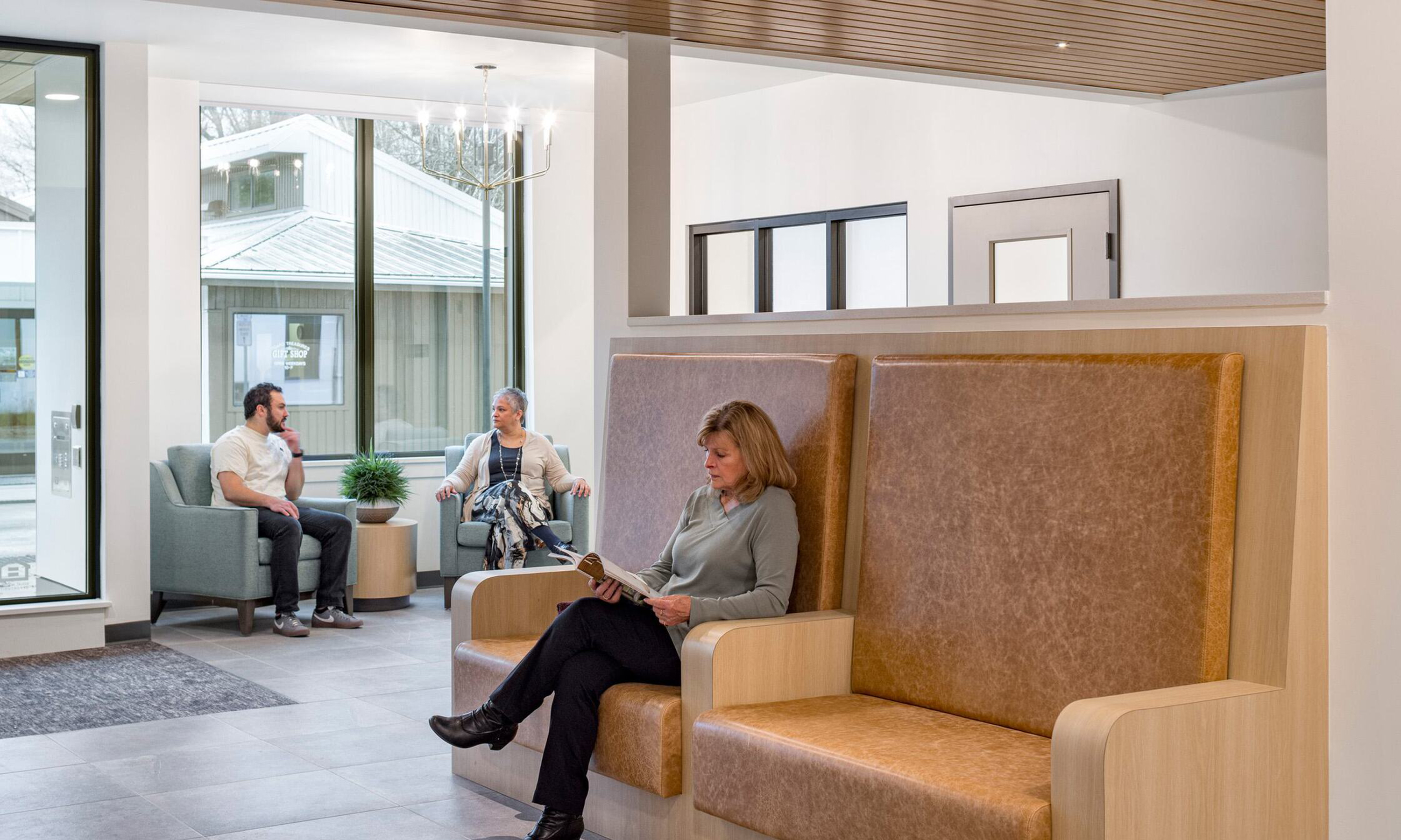Featured in the new project is an easy pick-up and drop-off space for senior activities, manager and resident services offices, a lobby with a fireplace and a community room with a teaching kitchen and meeting spaces, as well as ADA-accessible walk-in showers.