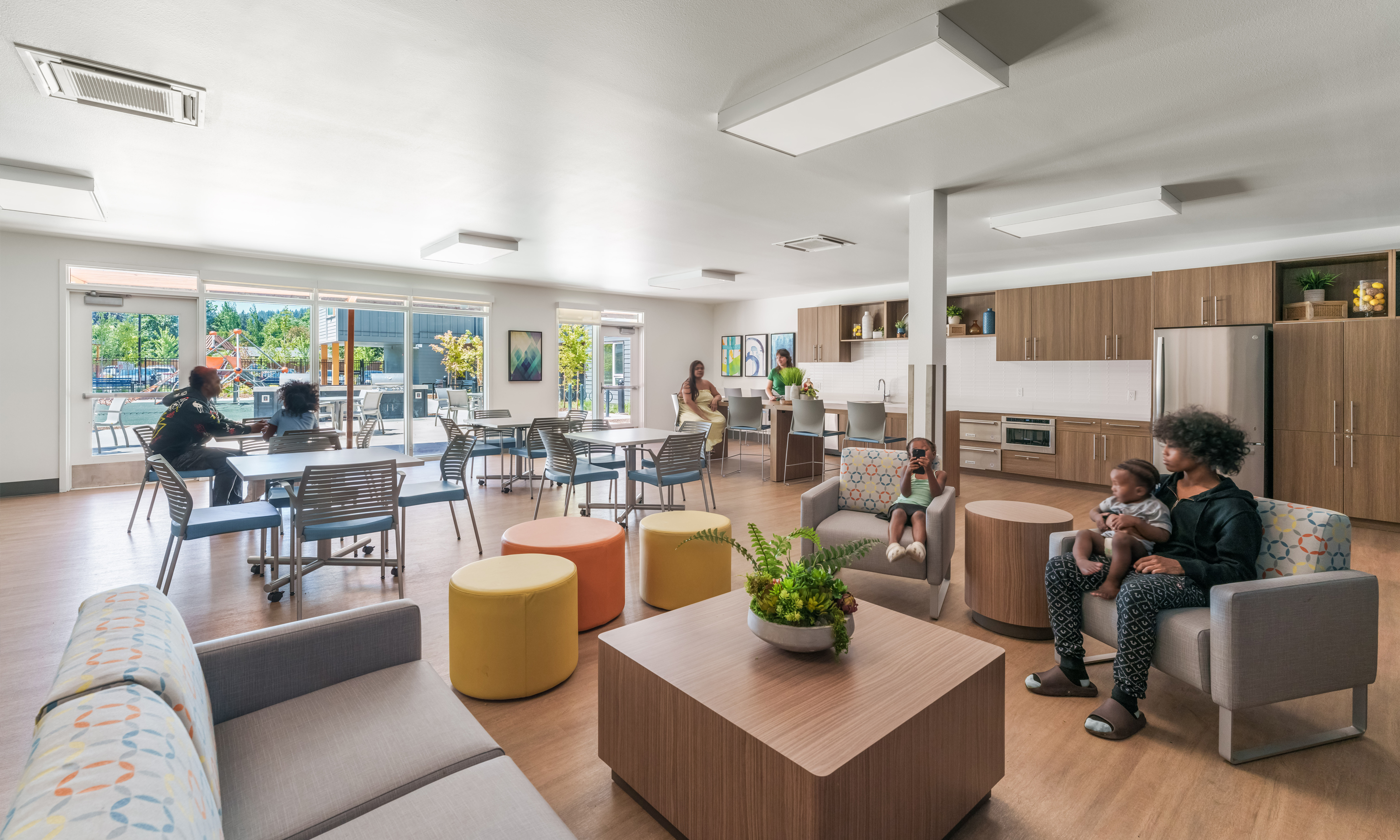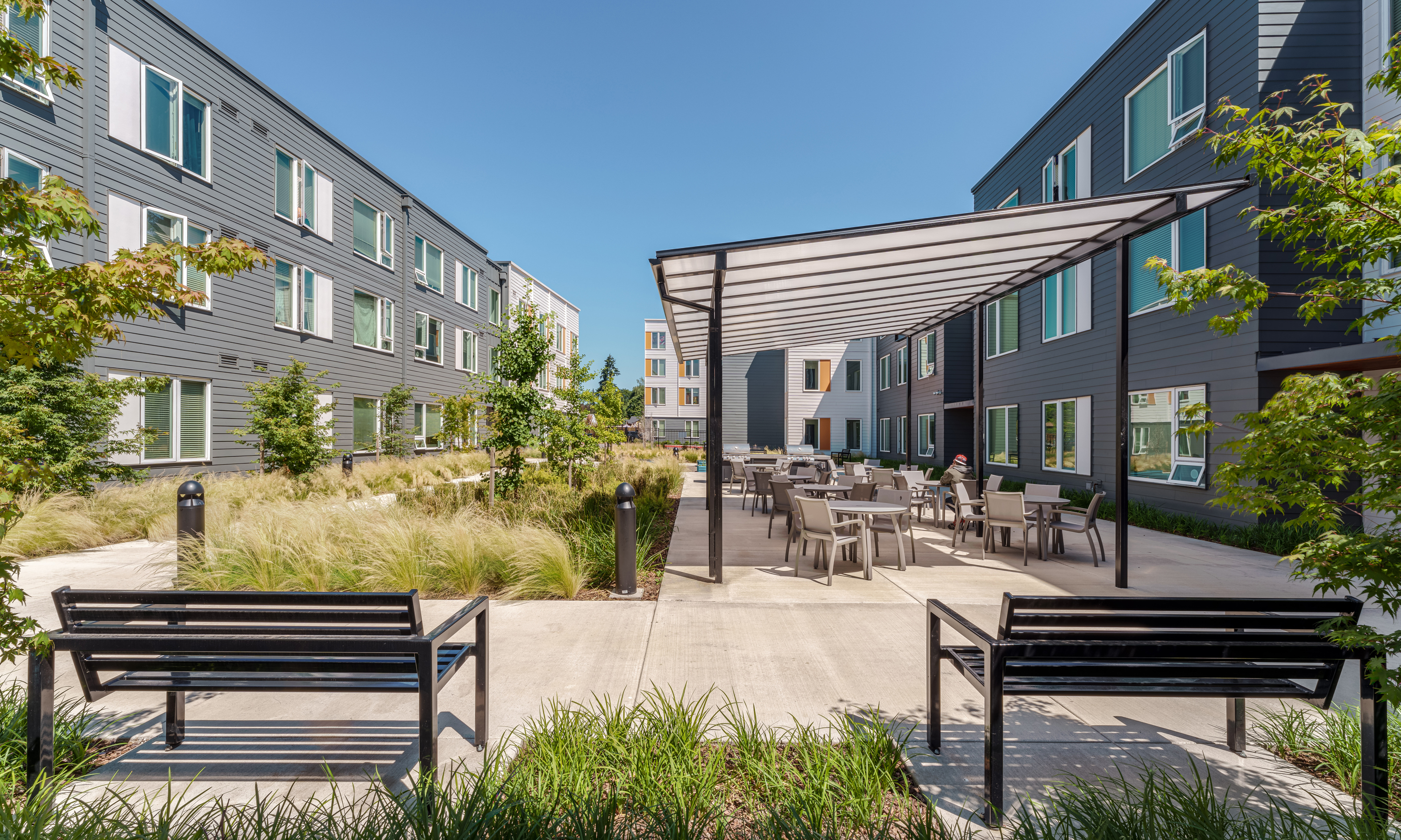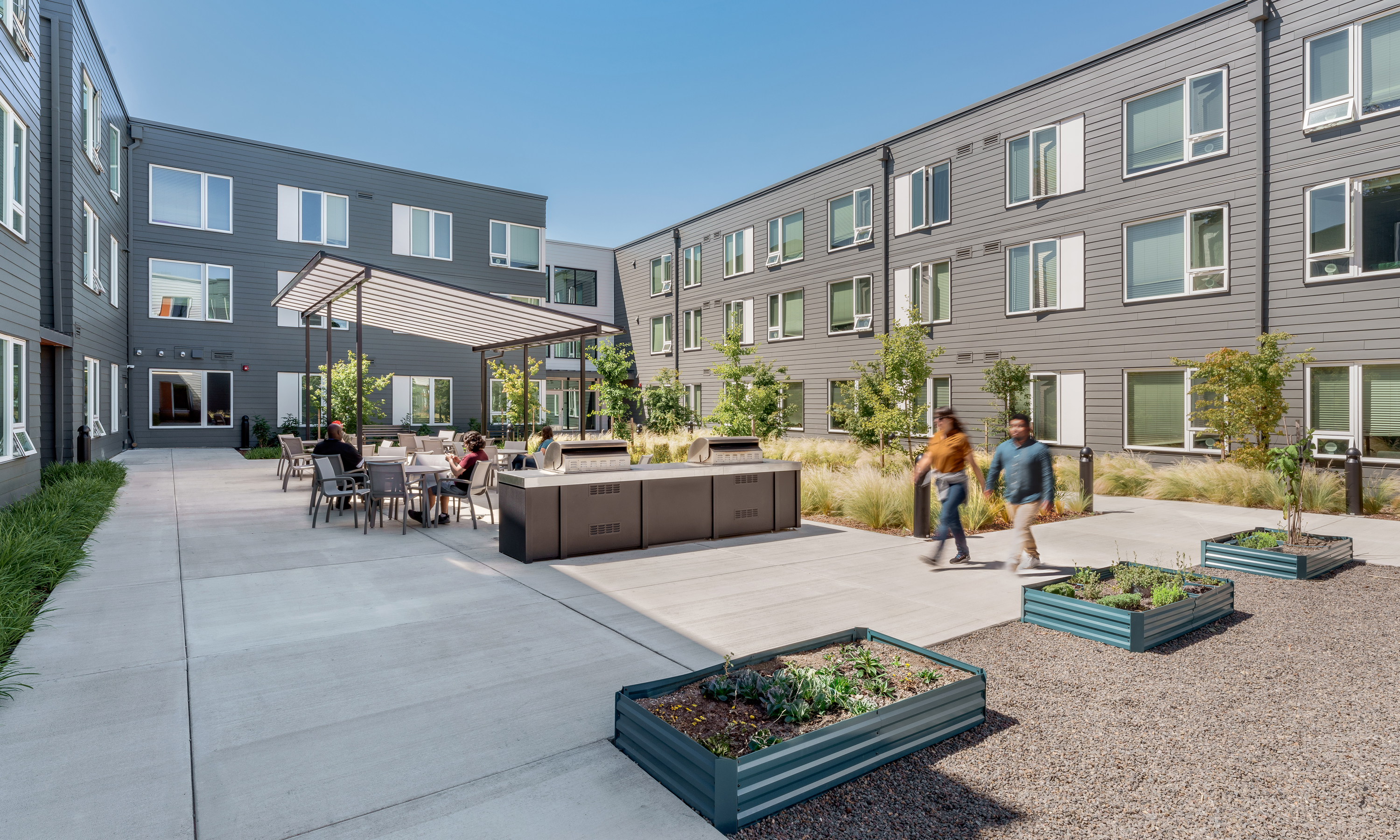 The project site is a long and deep site in a mixed-use zone along Powell Blvd, a busy vehicular and public transportation corridor with low-scale commercial and residential buildings. Due to the location in a mixed-use zone, there was sensitivity around the building scale and the proximity to Powell Blvd, parking, and access to outdoor green space. The design team situated the 3-story building along the street frontage to connect to the area’s low-scale commercial and residential buildings and placed the 4-story building along the back zone of the site. The dual courtyards are central on the site, one oriented West to maximize daylight and the other North to acta as a barrier to Powell. Both act as a vibrant central gathering place for residents. The community room can be a hub for residents during seismic or other natural disaster events. The room has energy usage powered by part of the solar array, integrated device charging stations, and a food pantry. The project installed a 130 KW Photovoltaic system utilizing a hybrid ballasted racking system which reduced the amount of penetrations in the building roofing.