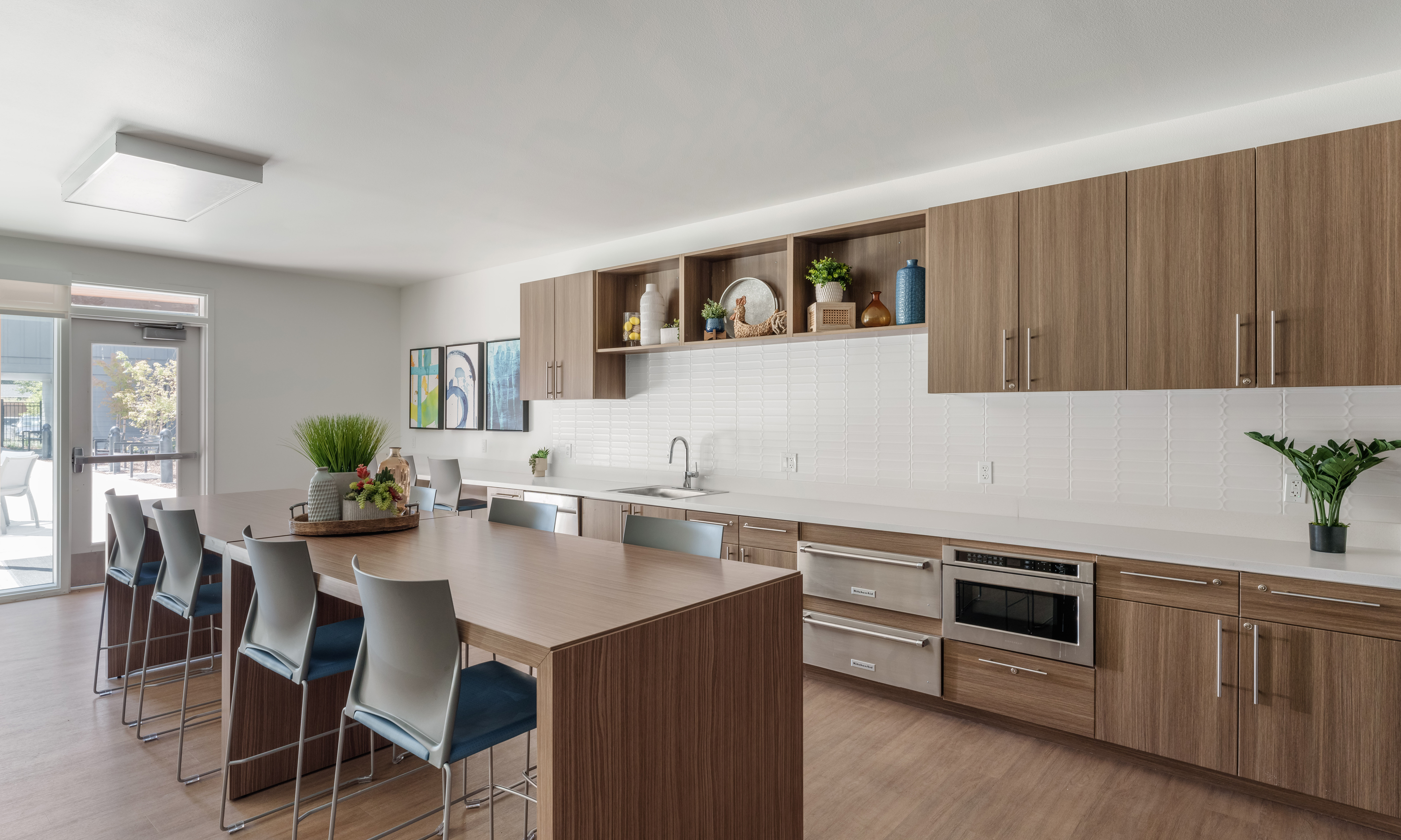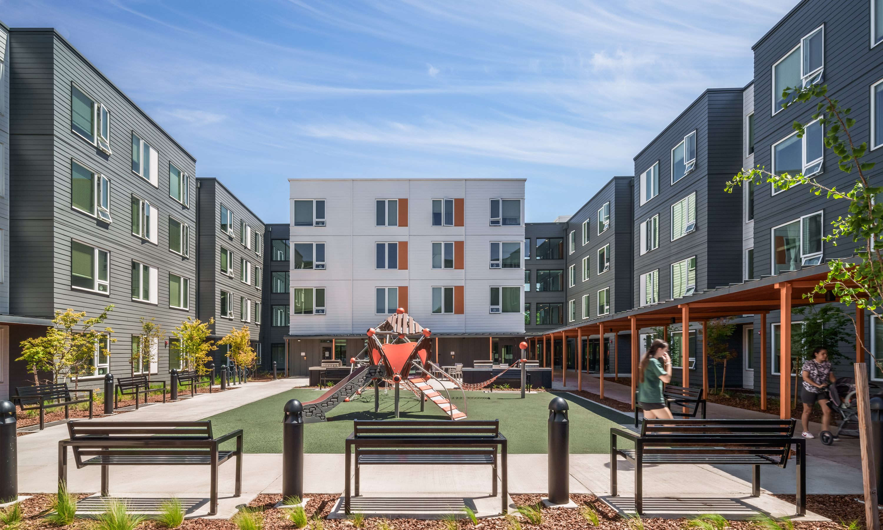 The Canopy Apartments at Powell is a 169-unit affordable apartment community in East Portland developed by USA Properties Fund in collaboration with Northwest Housing Alternatives and Oregon Housing and Community Services. Located on a 3.8-acre parcel, this multi-family development consists of a three- and four-story building, with ample on-site parking and an electric vehicle charging station. The units, the majority of which are 3 bedrooms, include energy-efficient appliances; laundry on each floor; and low-flow faucets, showers, and toilets. The affordable housing development features abundant community resources such as a bike room, outdoor courtyard, playground, dog wash station, and a donation pantry, allowing residents to share food and resources. The Canopy features numerous green-building upgrades, including high-performance windows and a solar panel system, that will help boost the building’s energy performance by over 25% compared to industry averages.