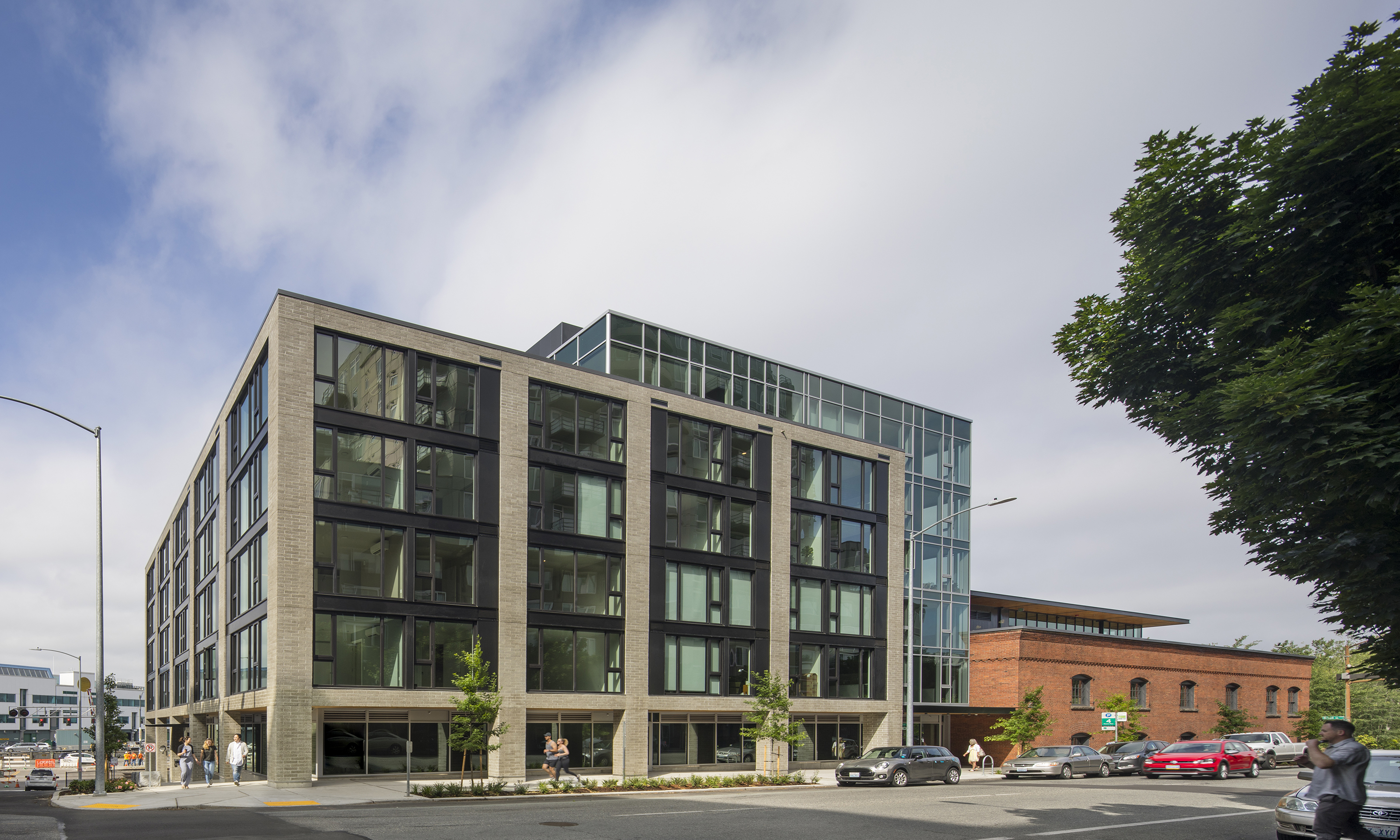 This project included the renovation of the historic landmark as well as new construction of a mixed-use building located next door. The renovation of the existing two-story structure consisted of modernizing the building for commercial and office use while adding an addition at roof level. The new construction consisted of an 86,800 sf seven-story apartment building with one below-grade parking level. The building houses 61 large units and ground floor commercial space.