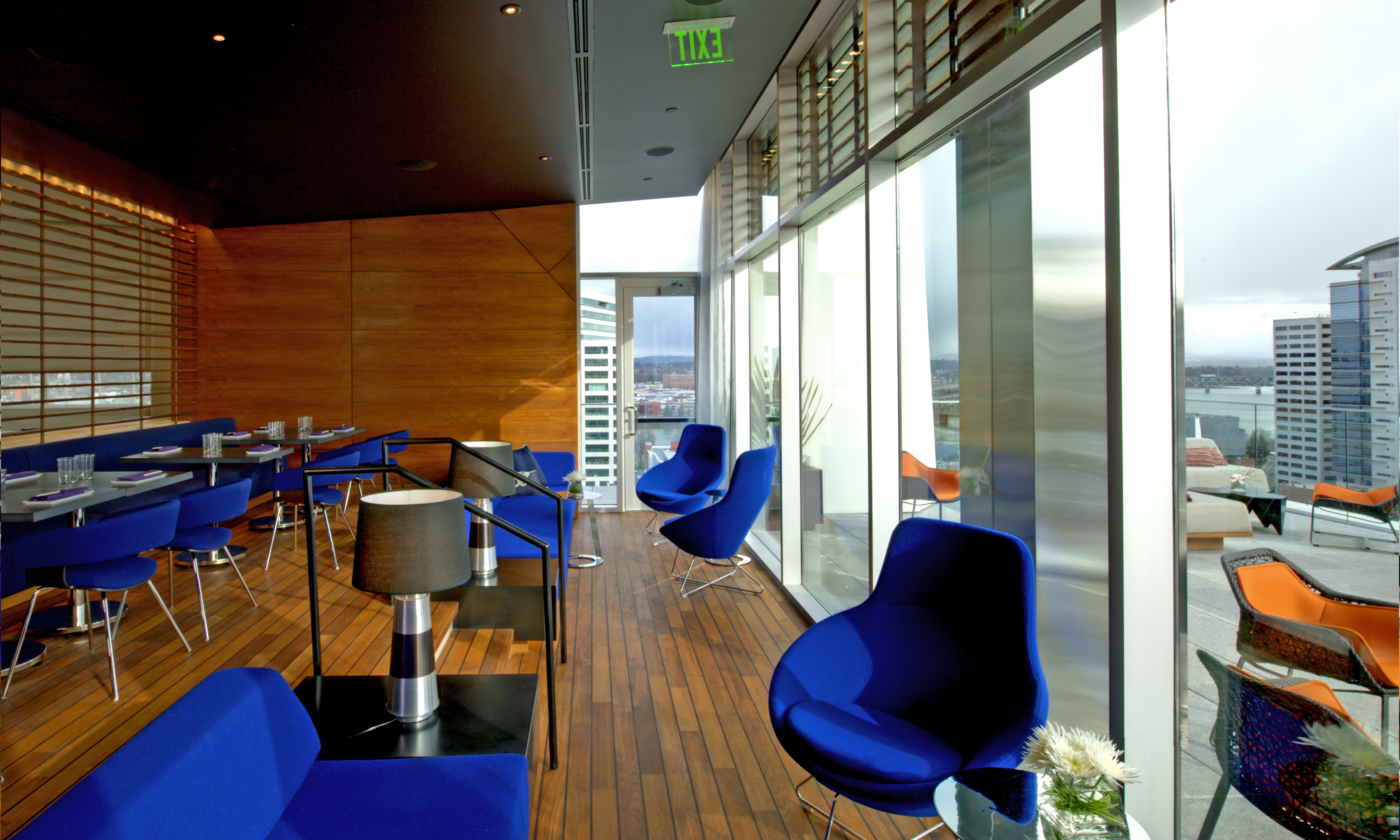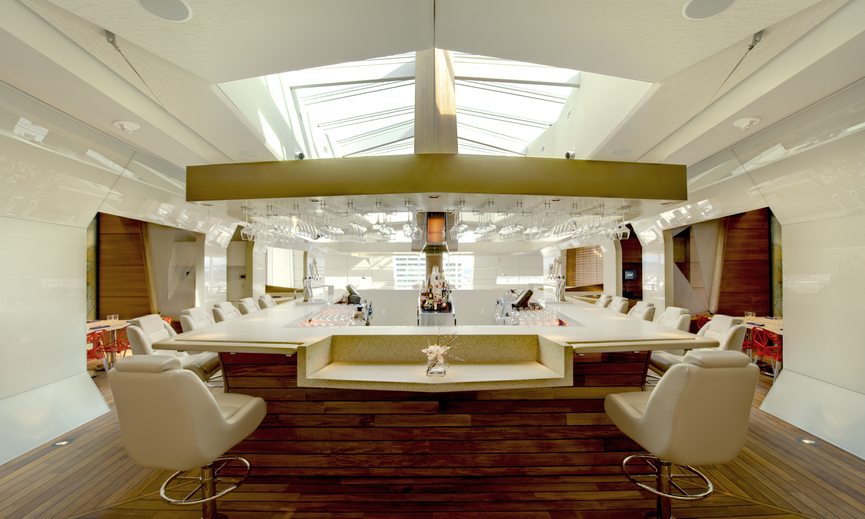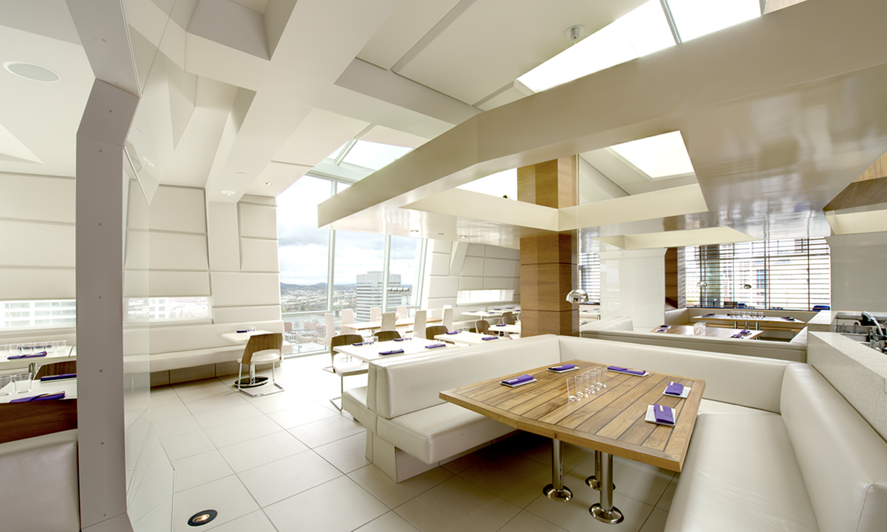 Offering an unexpected perspective on Portland’s urban cityscape, including a bird’s-eye view of bridges and distant mountain peaks, Departure Restaurant & Lounge opened on the 15th floor of the luxury hotel, the Nines. This 12,000 SF innovative bistro features a modern-Asian cuisine, as well as a roof top outside seating area with breathtaking views of the city. With a design theme that settles in somewhere between a spaceship and a cruise liner, few plumb surfaces and nearly no straight walls, the project presented itself as a marvelous challenge.