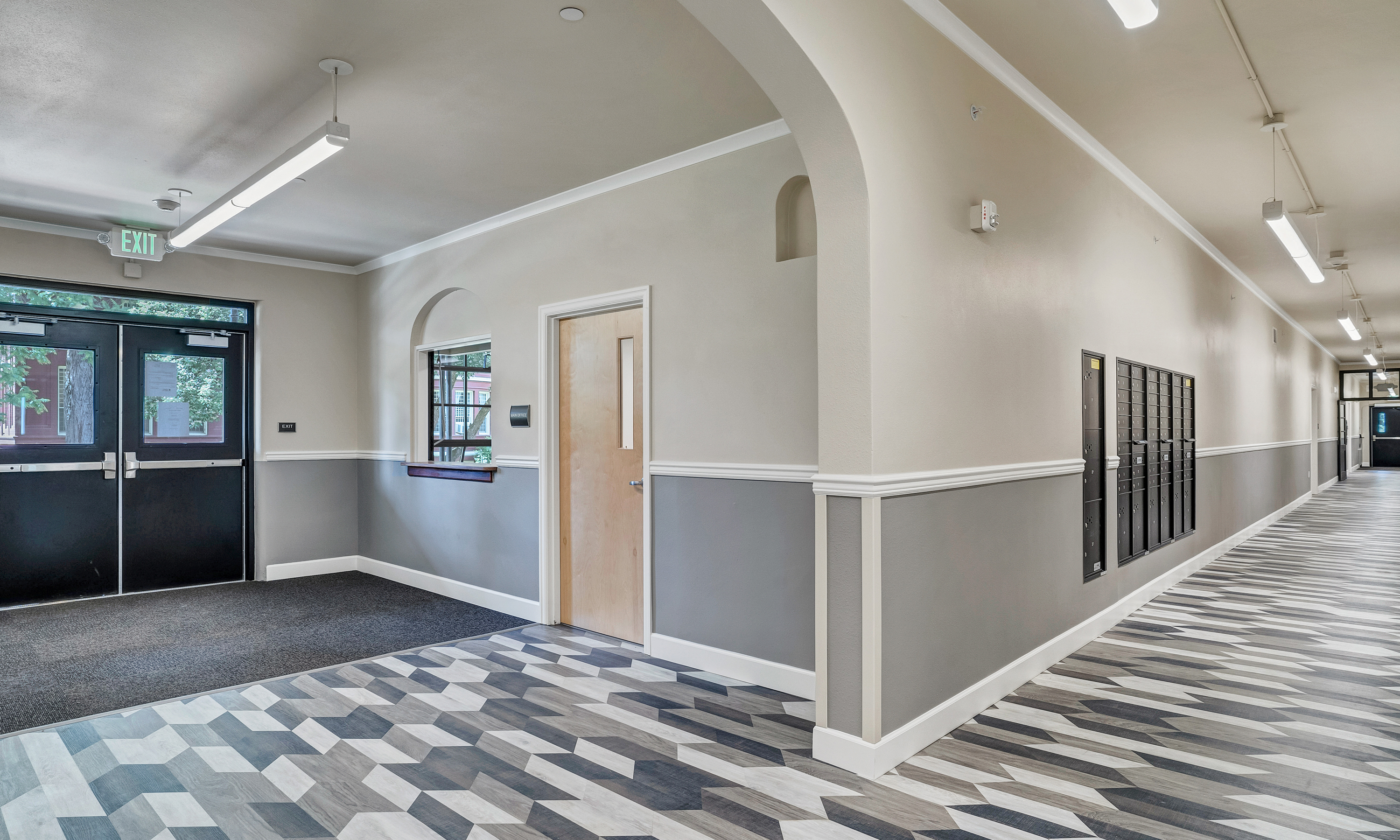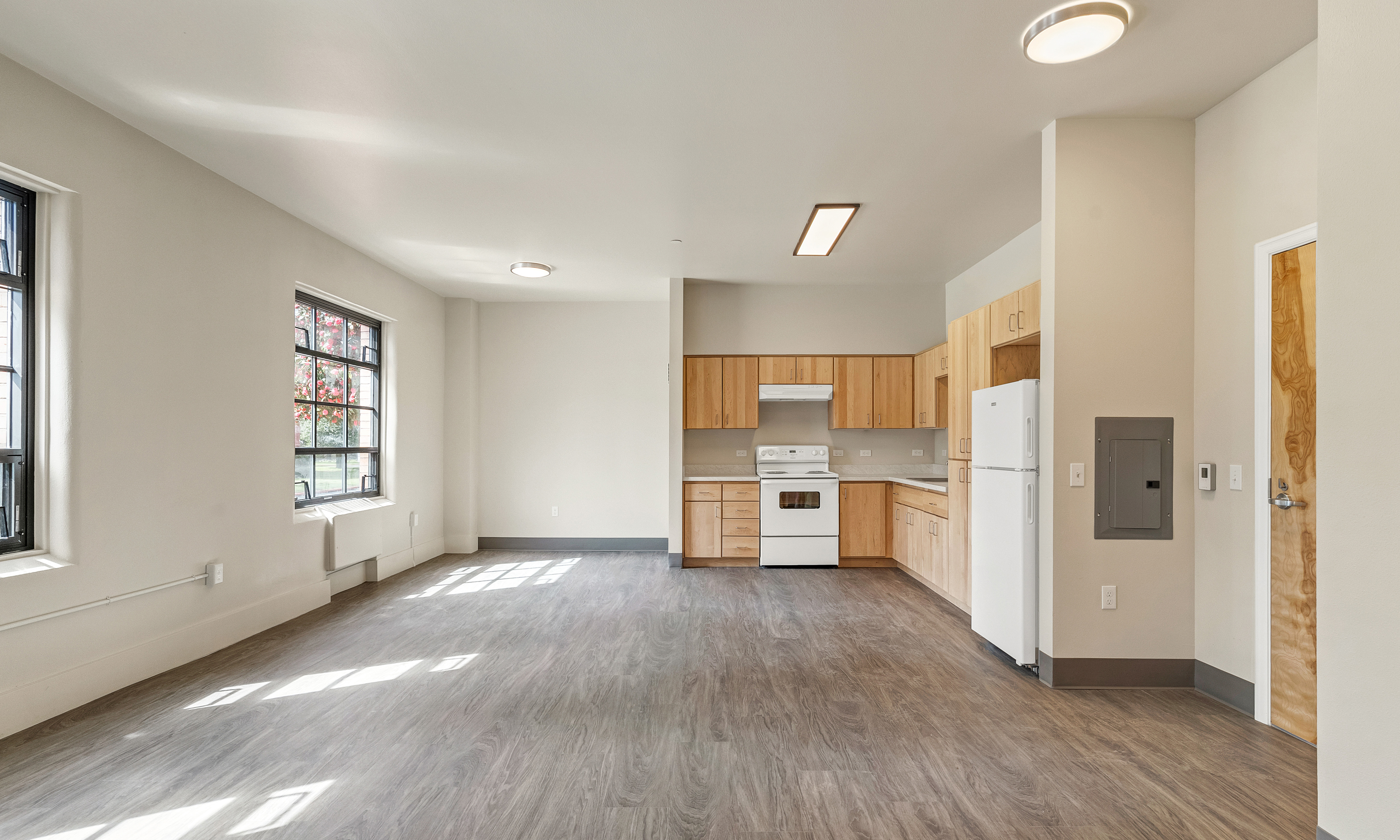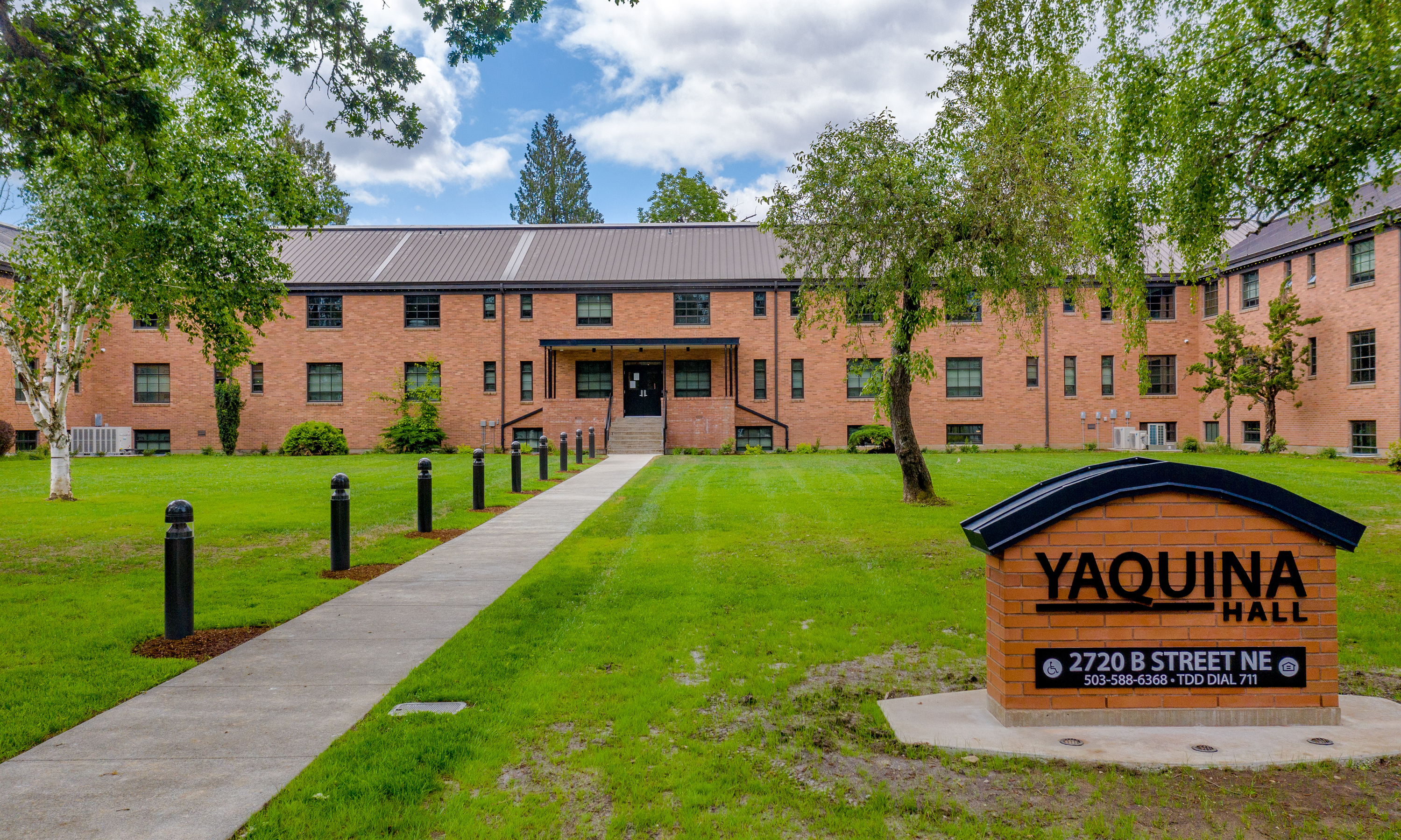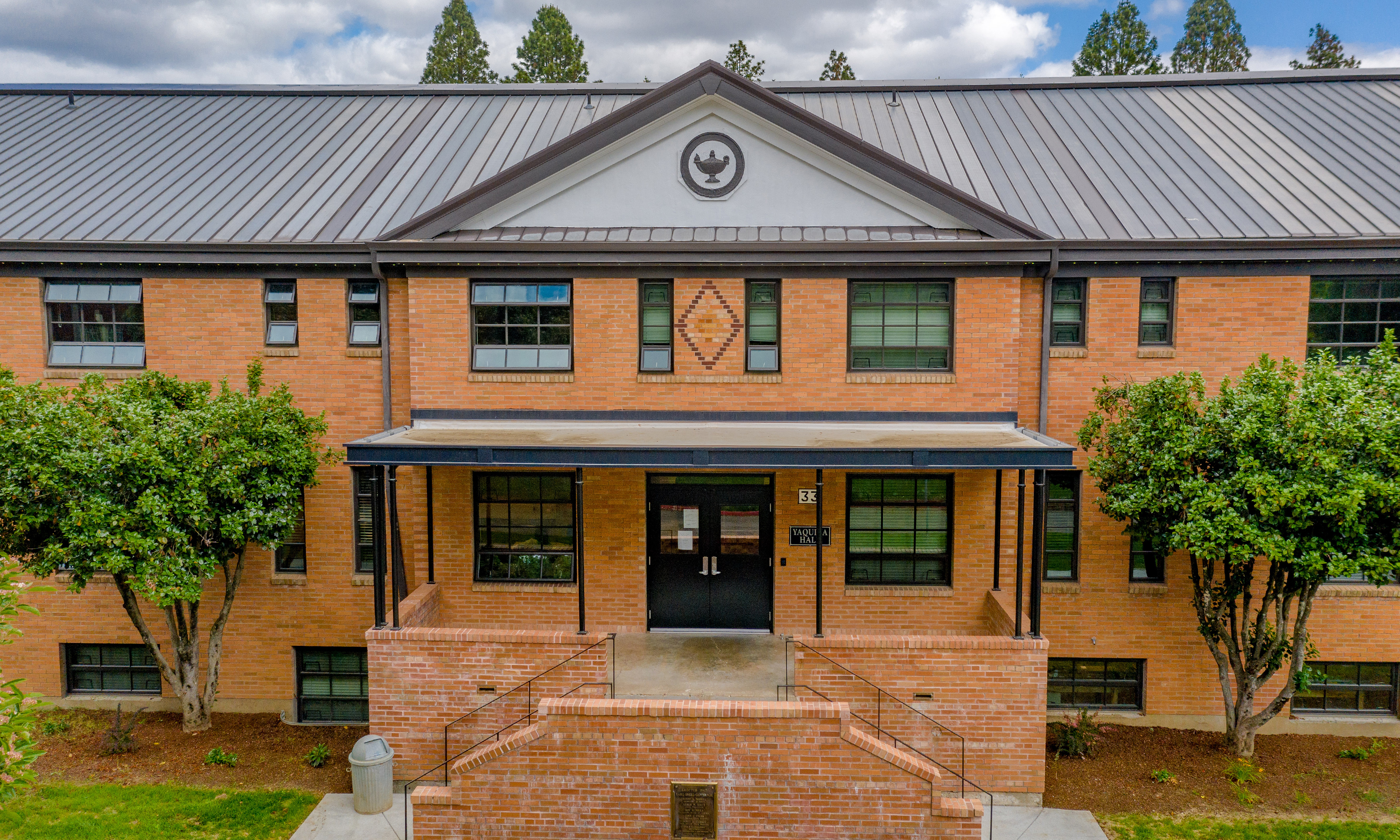 The Yaquina Hall Apartments, a historic renovation to the former Oregon State Hospital Nursing building in Salem, provides 52 units of supportive housing designed to address the needs of Salem’s most vulnerable, including those with serious and persistent mental illness. On-site supportive services address the unique needs of community members experiencing homelessness, and those with disabilities in developing permanent housing goals. The building, located at the Oregon State Hospital North Campus, is on the National Register of Historic Places, serving as a nurses’ dorm from 1947 until 1971. The 50,900-square-foot, three-story brick building once housed a library, lounge, and wooden pediment holding a medallion with an oil lamp to represent nurse Florence Nightingale – the medallion is one of the historical elements that was lovingly preserved in place.