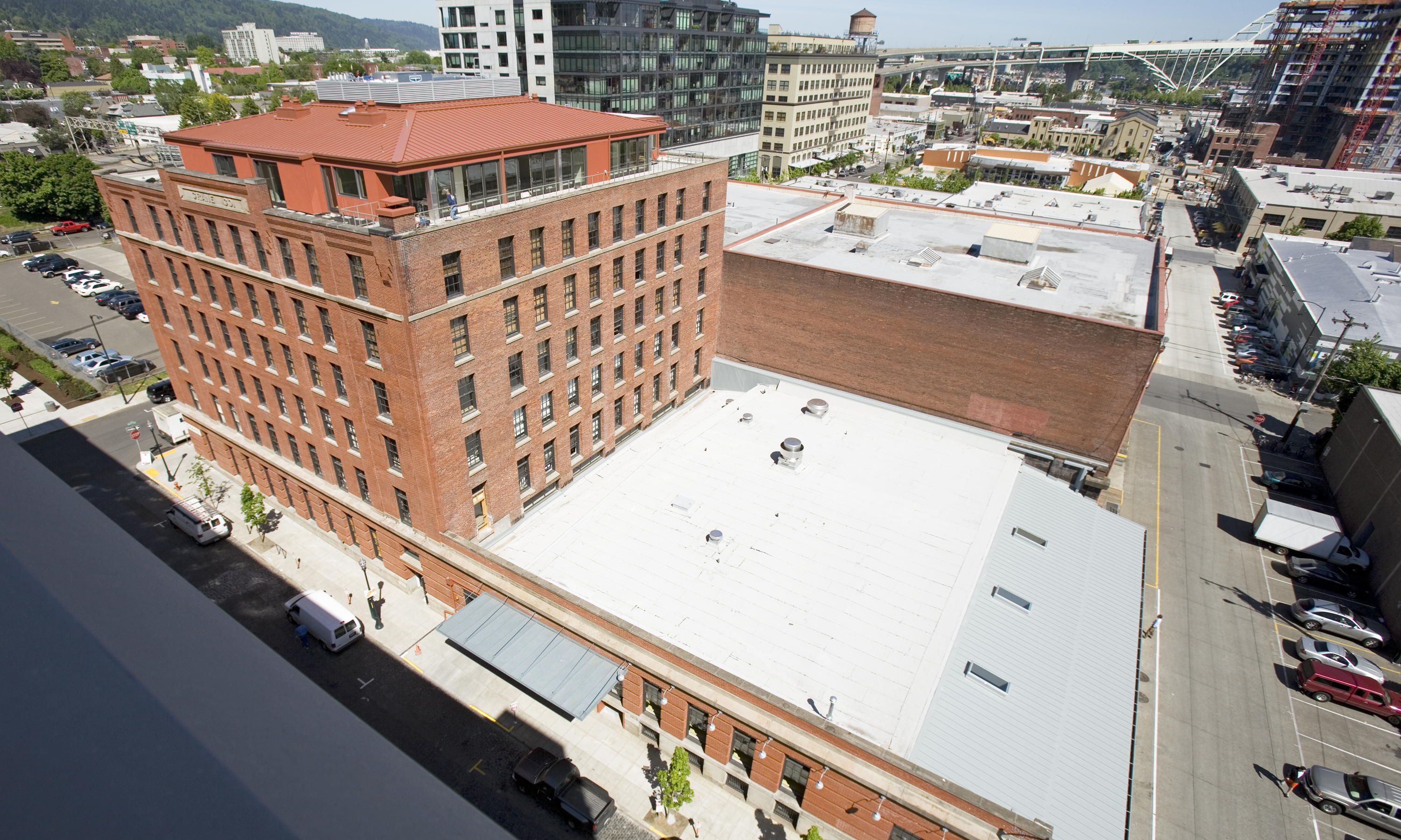 The Crane Building was built in 1909 as a warehouse for the Crane Plumbing Company. Located on a half-block in Portland’s 13th Avenue Historic District, the 98,500 SF Crane Building conversion included 26,000 SF of retail and office space, 30 apartments, two high-end penthouse units, and a 20,000 SF basement converted to 46 structured parking spaces. The eastern half of the site included the conversion of a high-ceilinged one-story space with a loading dock into an 8,500 SF high-end restaurant. Seismic upgrades on the project include the addition of over 2,000 cubic yards of concrete to stabilize the existing structure with a mat slab that supports concrete shear walls rising 100+ feet through the building. The existing roof structure was removed and a new conventional concrete slab placed to support the new penthouse units.