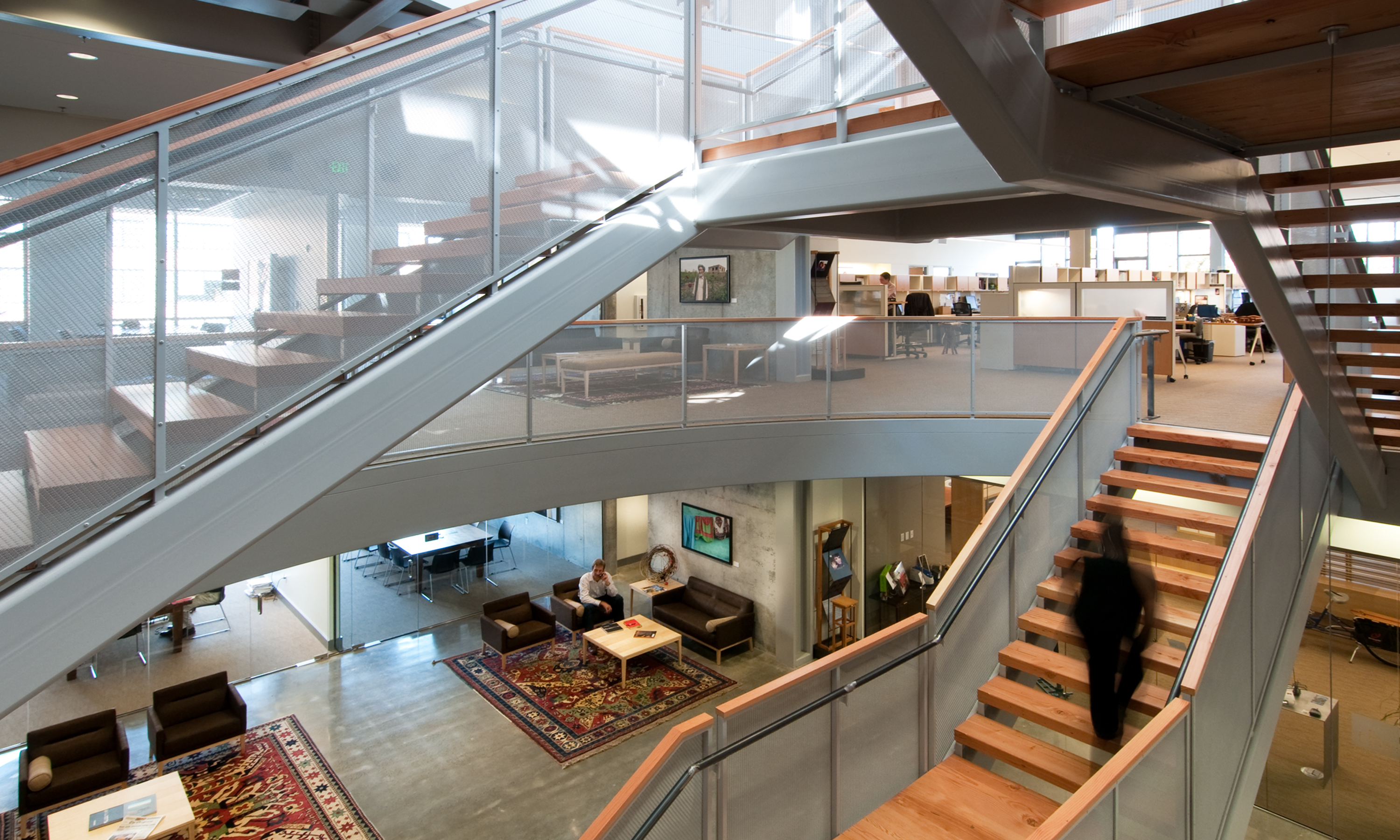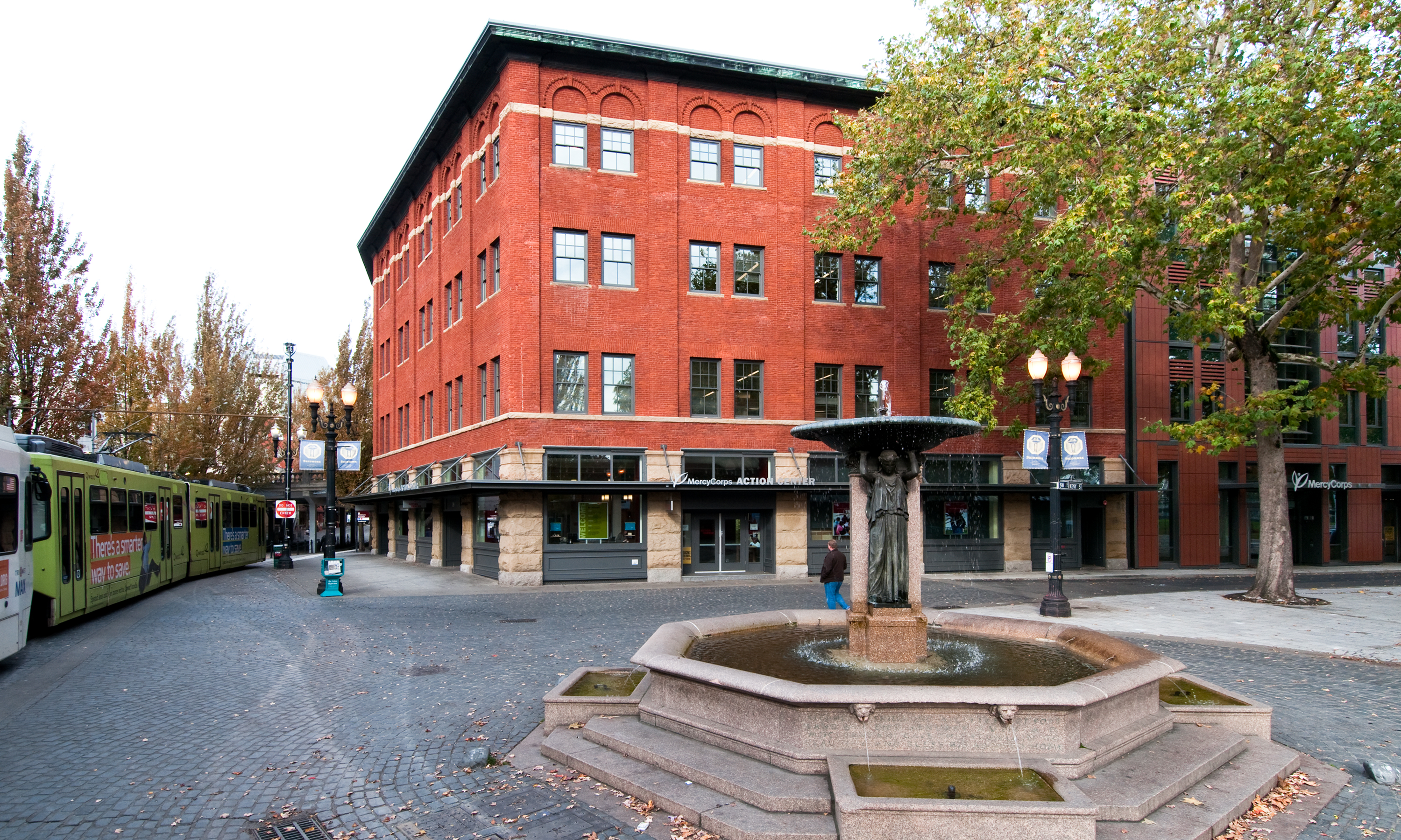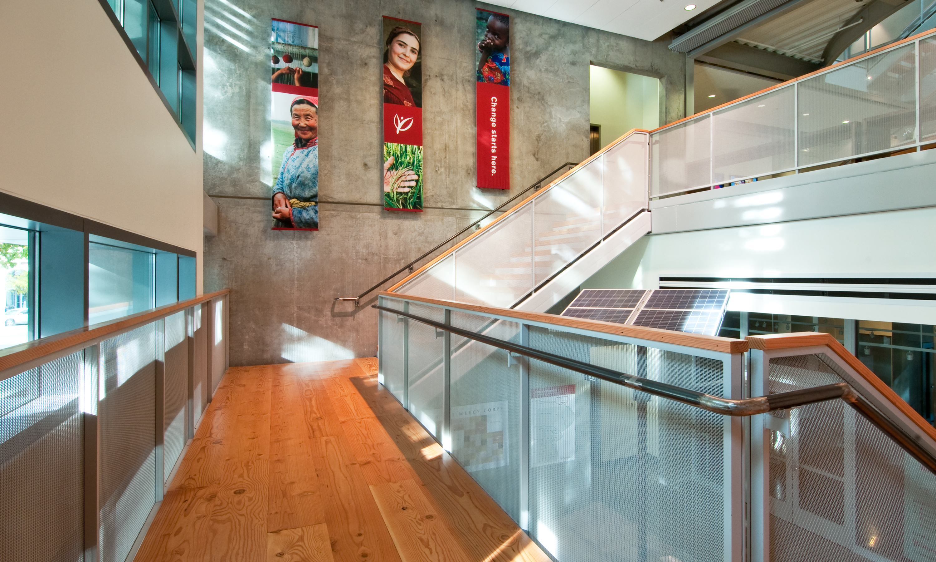 The entire structure now houses offices, an educational Global Action Center open to the community, the Lemelson Foundation, and a small retail space. To achieve a LEED Platinum rating, Mercy Corps incorporated many of the typical methods including: a green roof and solar array, period appropriate energy-efficient windows, pervious pavers, a system of six planters designed to slow rainwater runoff, recycled content of building materials, low VOCs and significant construction waste management.